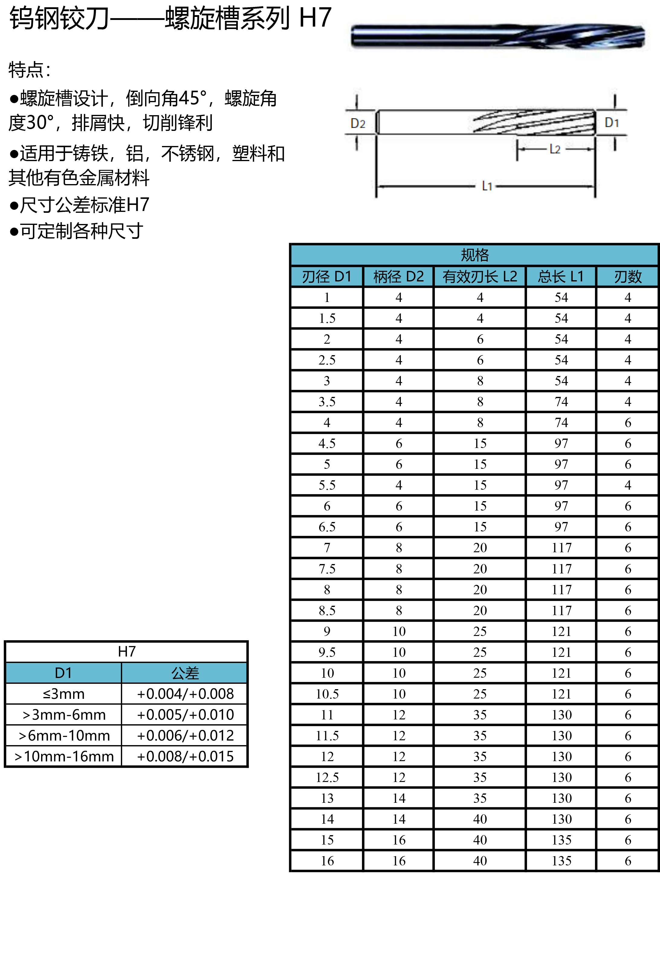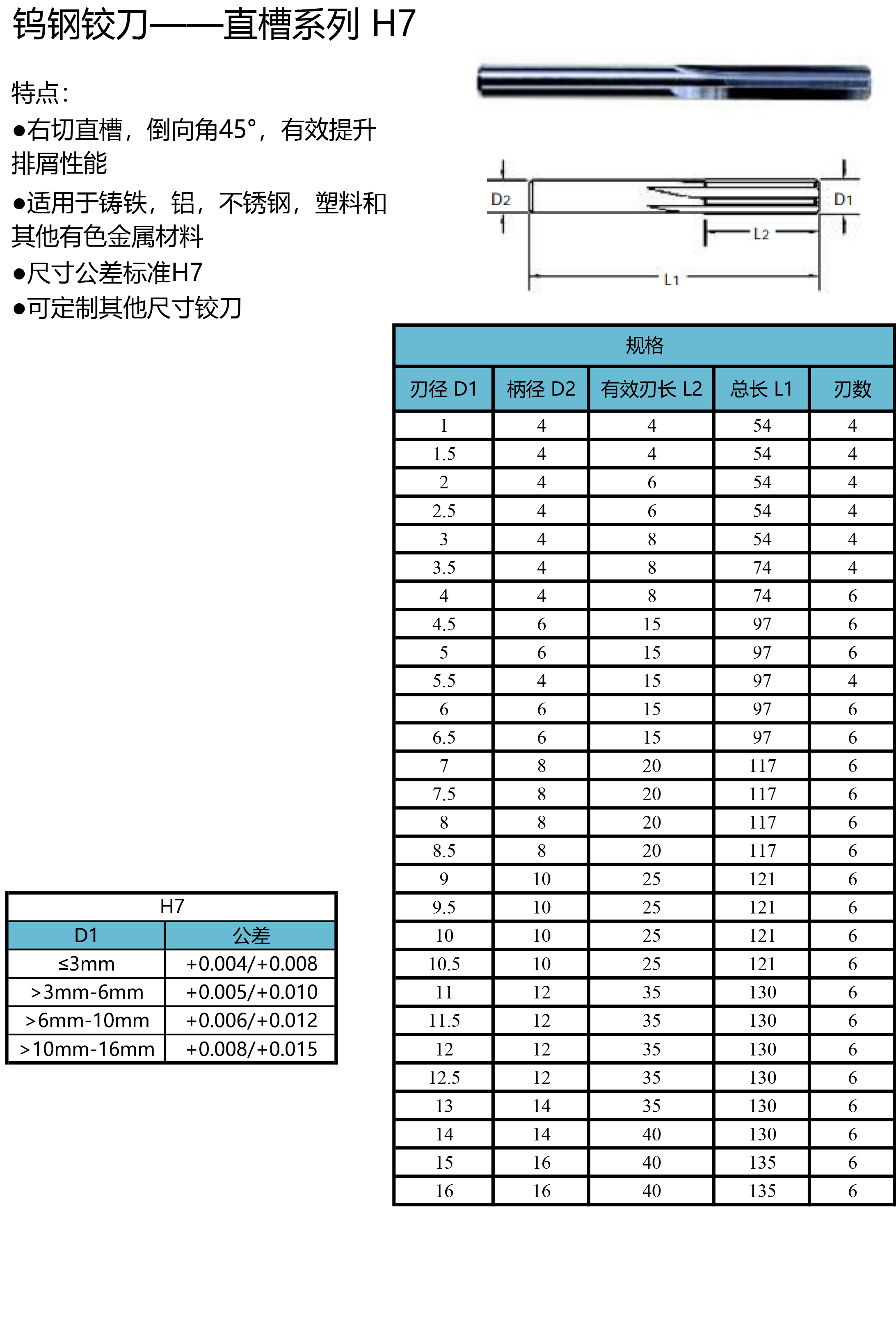 直槽螺旋槽 鎢鋼鉸刀H7